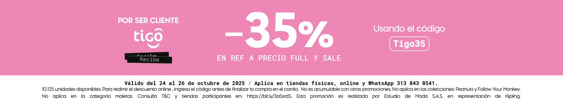 Prepárate para la aventura, ¡con un 35% de descuento en ref. precio full y Rack! Hemos unido fuerzas con TIGO para que puedas llevarte tus esenciales favoritos con un descuento que no puedes dejar pasar. Del 24 al 26 de octubre del 2025.